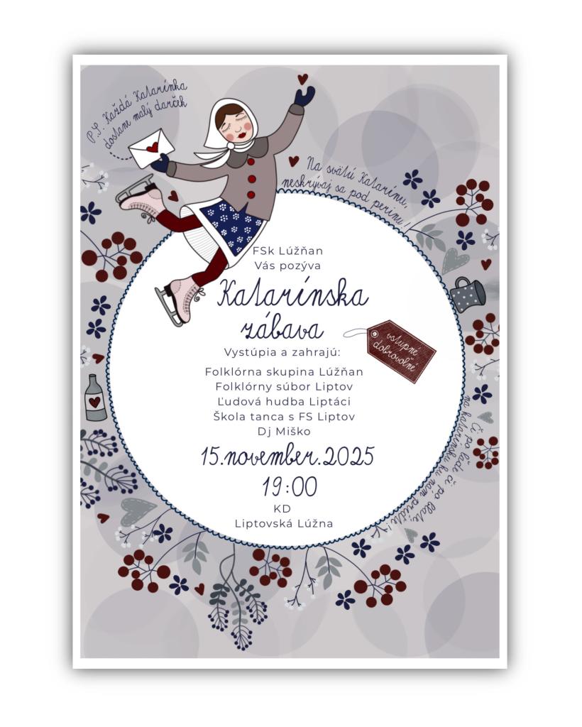 Folklórna skupina Lúžňan Vás pozýva na tradičnú katarínsku zábavu spojenú s kultúrnym programom, ktorá sa bude konať 15. novembra od 19:00 v kinosále Kultúrneho domu.