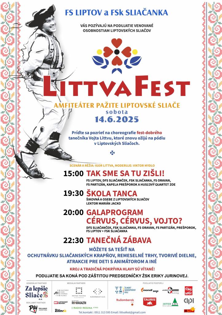 FS LIPTOV a FSK SLIAČANKA vás srdečne pozývajú na podujatie venované osobnostiam Liptovských Sliačov, ktoré sa uskutoční 14. júna 2025 v amfiteátri. Príďte na vystúpenia tanečníkov a užite si bohatý program plný kultúry a zábavy.